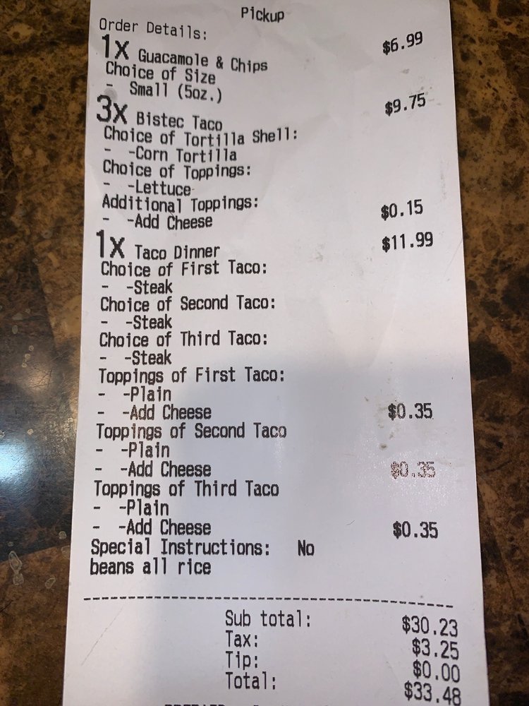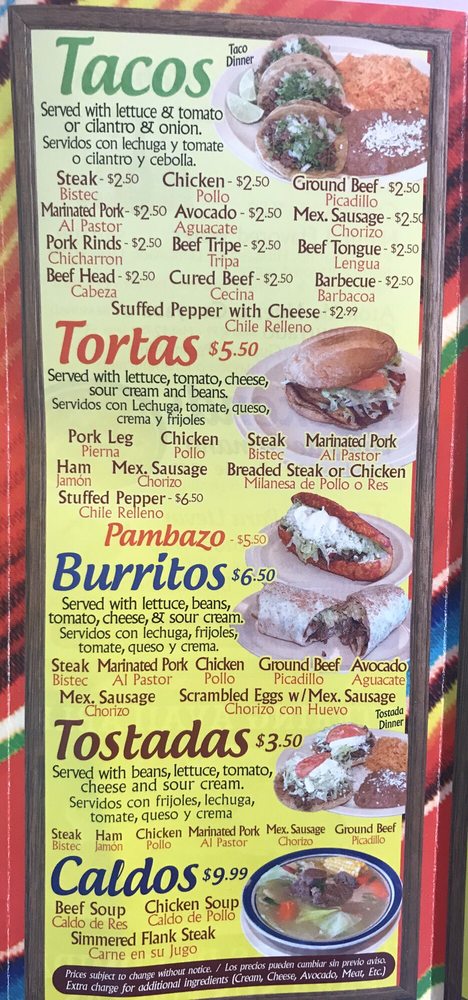 Bistec. Pollo. Picadillo. Al pastor. Aguacate.